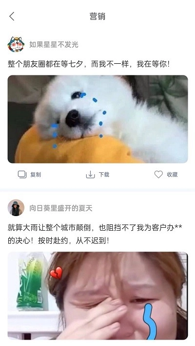4、精心匹配图文素材搭配增效辅助功能:除了海量文案,还提供精心匹配的适配配图素材,让发圈内容更丰富吸睛。