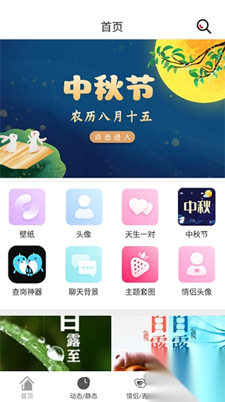 1. 打开应用,映入眼帘的是壁纸、头像、情侣配对、节日专题、聊天背景等多样分类,你可随心挑选喜爱的内容,直接下载即可。