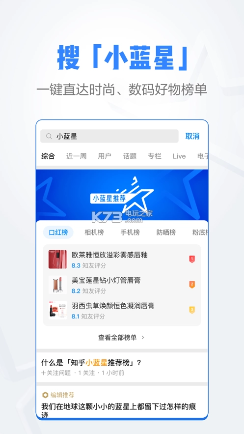 打开知乎,搜索「小蓝星」,即可迅速获取客观公正的时尚、数码优质好物榜单。