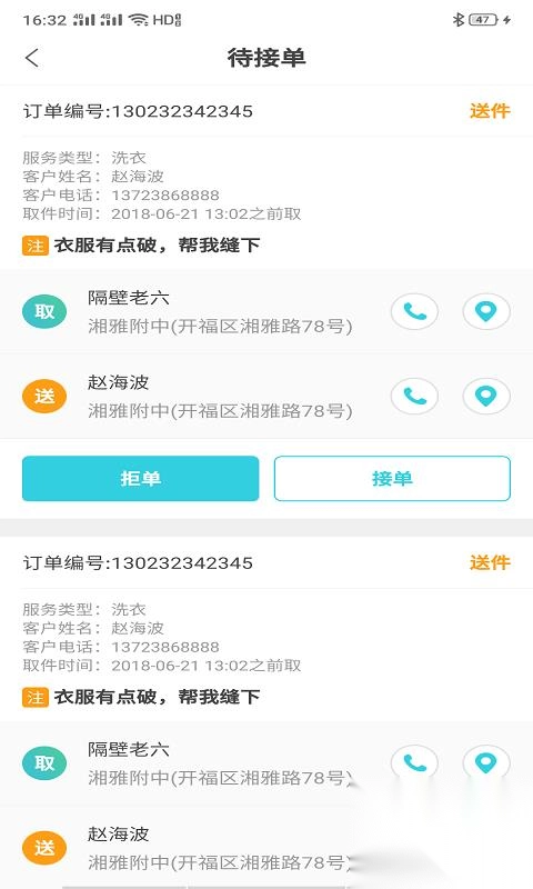 订单详情:每一笔订单的信息均有详尽记录,用户可先进行了解,之后再决定是否接单。