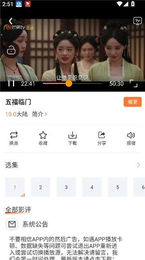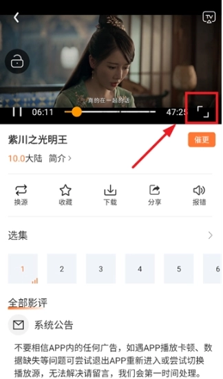 1、进入之后,你既能够直接进行搜索,也可以从推荐等板块进入到想看的影视界面。在该界面,点击视频播放画面,然后点击如图所示的全屏播放按钮。