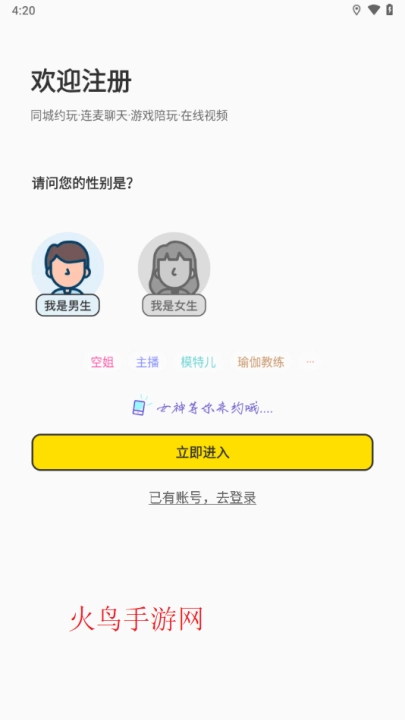 3、选择你的性别后点击立即进入;