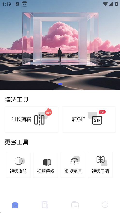1、首页设有精选工具与更多工具,涵盖时长剪辑、转GIF、视频旋转、视频镜像、视频变速以及视频压缩等操作。