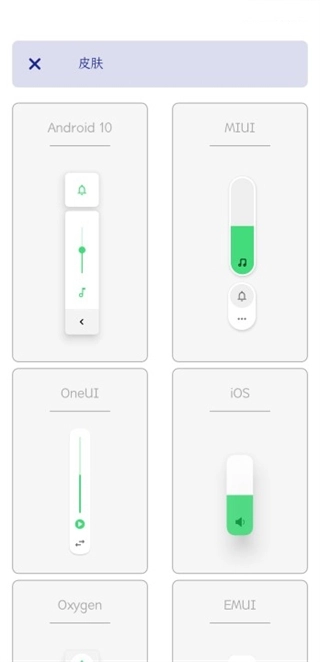 如果你想解锁更多姿势,点击首页的皮肤按钮,更换各种类型的皮肤,这里提供了14种音量面板皮肤,Android10、MIUI、OneUI、EMUI等等常见的不同手机音量样式。