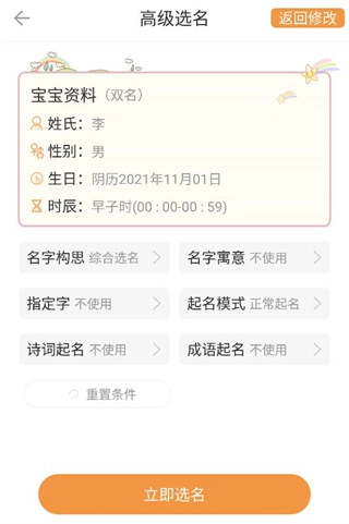 2、进入到主页,先输入宝宝的姓氏、性别、出生日期等等信息,点击立即选名。