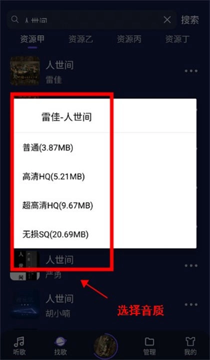 2、接着,在扩展菜单中会弹出音质选择选项,用户只需挑选出自己心仪的音质,点击确认即可。
