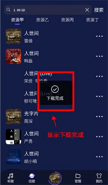 3、歌曲下载完成的时候,画面会显示出“下载完成”的提示。