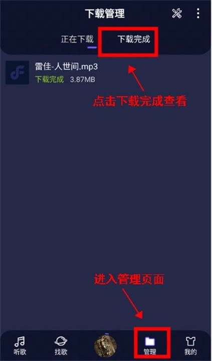 4、之后,用户也能够点击“管理”页面中的“下载完成”,查看已下载好的音乐。