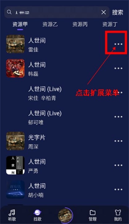 1、在找歌页面,用户搜索想要下载的歌曲,接着点击歌曲列表右侧的扩展菜单。