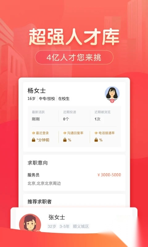 【简历推荐】根据当前发布职位,全智能推荐更优简历! 【在线沟通、实时邀约】同求职者直接面试,当天入职~