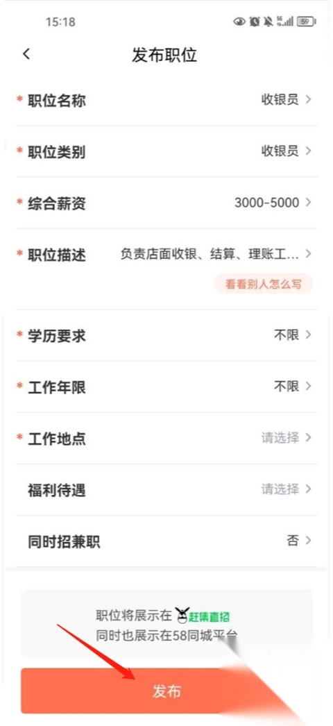 3、按要求填上员工薪资、学历要求、工作地点、福利待遇等后点击发布。