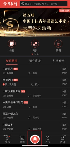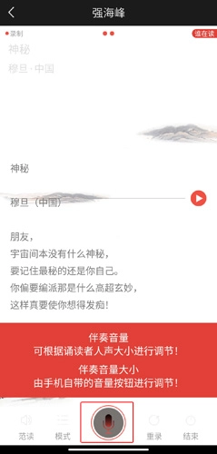 2. 进行朗诵录制:点击“k诗”按钮,进入录音界面。待伴奏加载完毕,点击麦克风,即可开始录制。