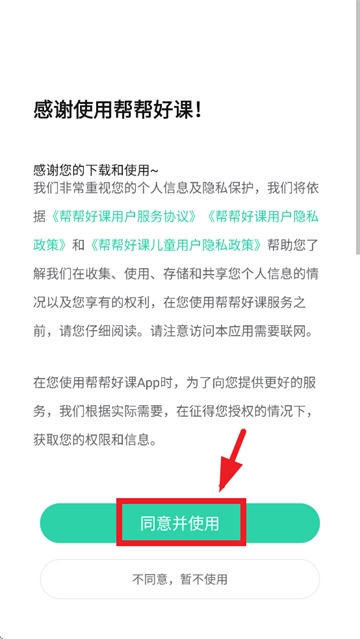 下载并安装帮帮好课app,打开后,当进入“感谢使用帮帮好课”提示界面时,点击“同意并继续” 。
