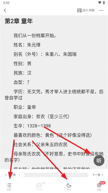 5、开启阅读后,点击“听”即可切换为听书模式,同时还能进行背景设置以及查看目录。