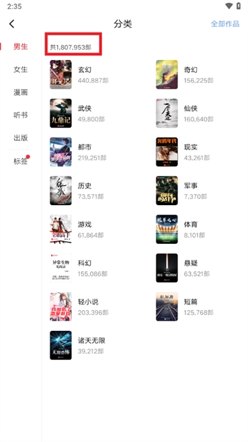 1、可以看见男生收录了1807953部