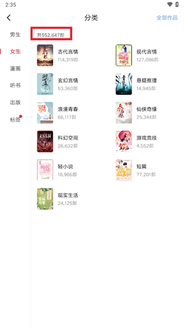 2、可以看见女生收录了552647部