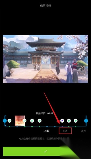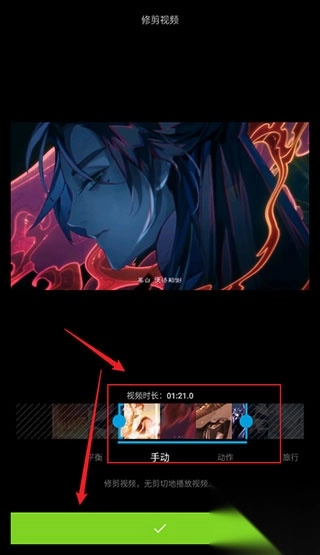 6、通过移动视频左右两边的滑块,对视频进行裁剪后,点击【勾】确定,如图所示: