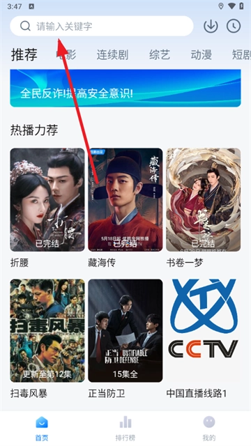 1、于本站下载软件,下载完成后打开软件,点击软件上方的搜索栏,在其中搜索自己想看的影片。