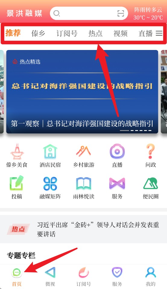 1点击“首页”可以查看推荐、热点、视频等本地信息和生活服务的入口。
