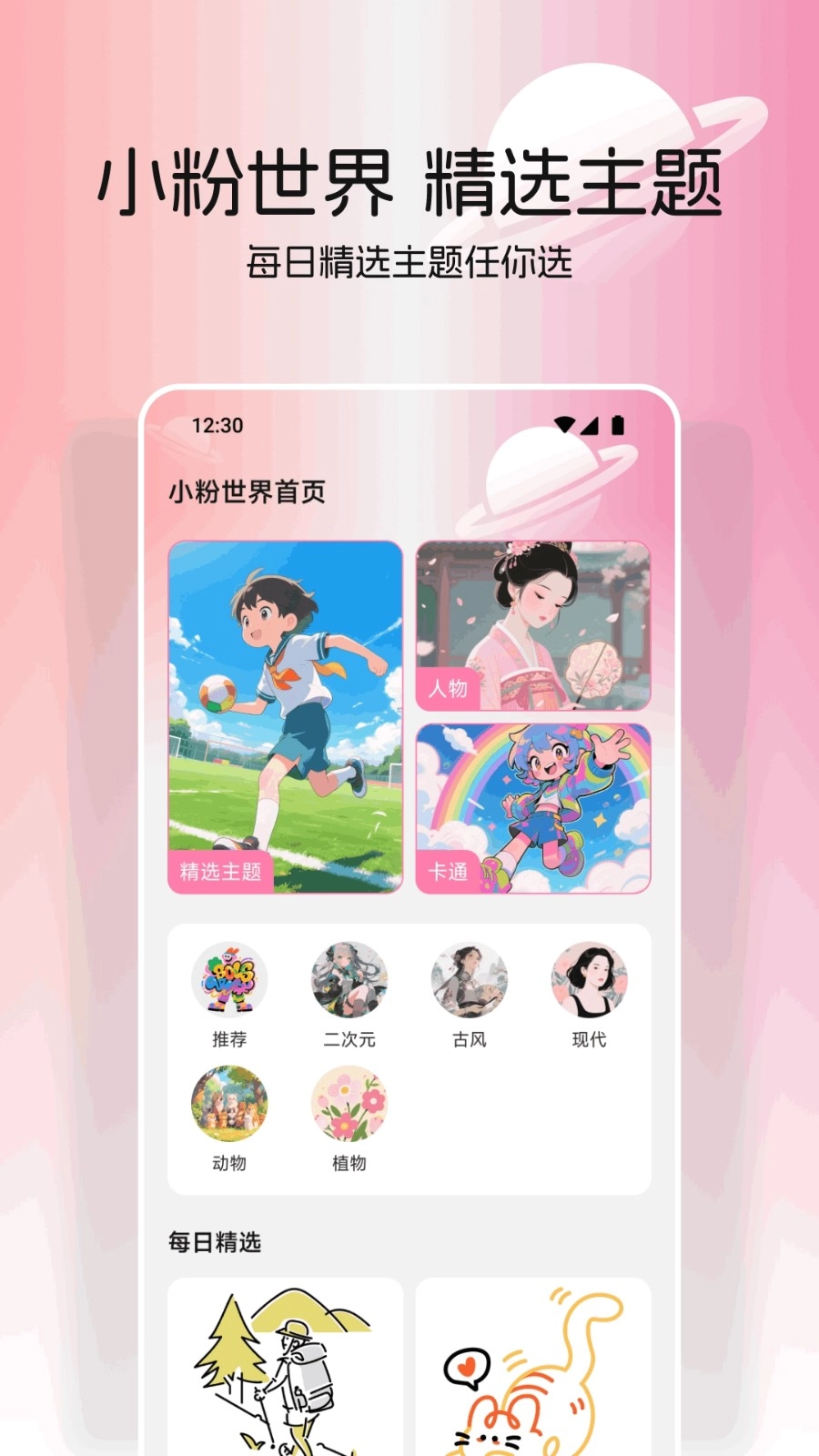 1、进入小粉世界壁纸软件,该软件可通过下载获取。进入后,其主页会为你推荐各类不同主题的壁纸。