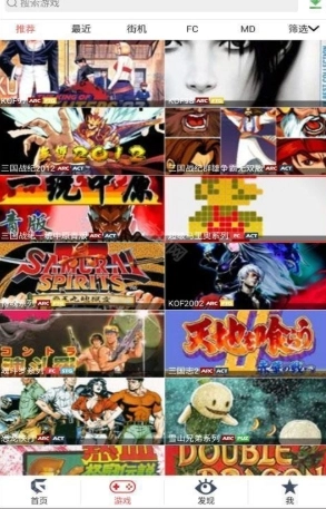 2. 进入首页后,界面呈现如下,能看到诸如街机游戏、fc游戏、md游戏等各类游戏。