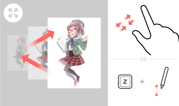 您能够通过两根手指捏合画布,实现画布的放大或缩小。要是连接了蓝牙键盘或者USB键盘,还能通过按住[Z键],同时拖动笔来进行放大或缩小操作。