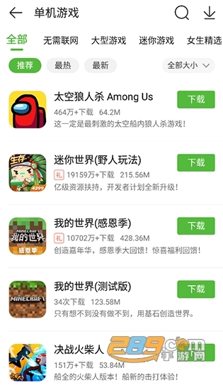 2、点击“单机”选项,挑选自己心仪的内容,点击其后方的“下载”按钮,就能下载到手机上,开始畅玩啦。