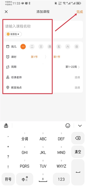 4、最后完善课程名称、周几、课时、任课老师、上课地点等信息,点击完成即可。