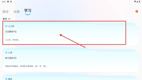2. 在学习页面,选中目标诗词,例如《人之初》,进而进入诗词详情页面。
