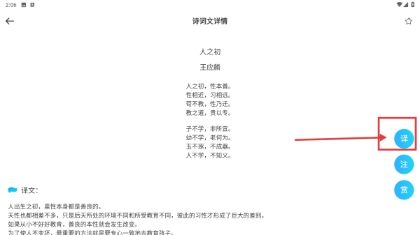 3、点击右侧的“译”按钮,即可查看诗词的现代汉语译文,助力理解。