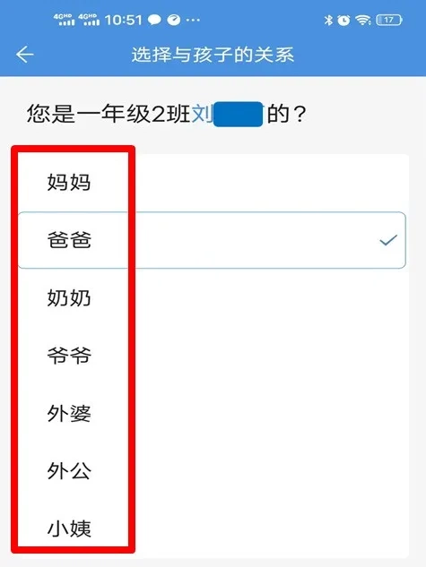 请选择您与孩子的关系。需注意,爸爸和妈妈可以同时为同一个孩子注册。选好“关系”后,点击“下一步” 。