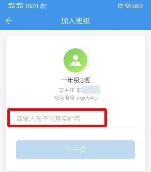 选择加入孩子所在班级,随后输入孩子姓名,需依照入学籍注册时的姓名用字填写,填写完毕后选择“下一步” 。