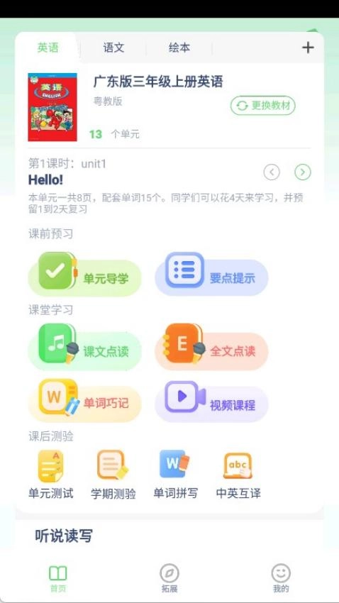 1、资源与粤教教材严格同步:和通用英语学习软件有所不同,这里的课本点读内容无论是原文还是排版,都与教材完全一样,测试题库也能精准匹配单元知识点,杜绝因资源与教材不衔接而造成的无效学习。