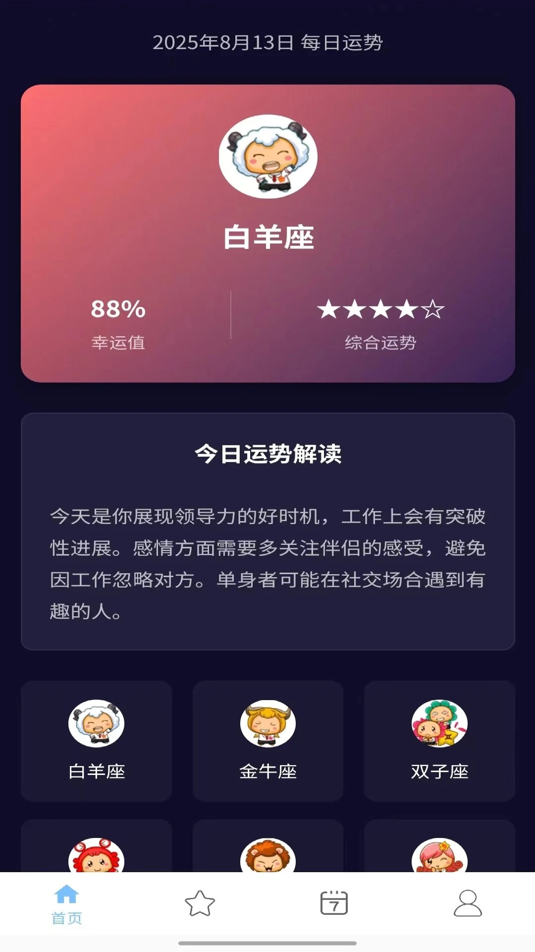 实时刷新各星座综合运势,全面覆盖爱情、事业、财富、健康等多个维度。