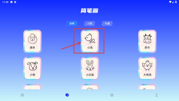 2. 在简笔画板块中,点击“小鸡简笔画”选项,随即进入小鸡简笔画的绘制界面。