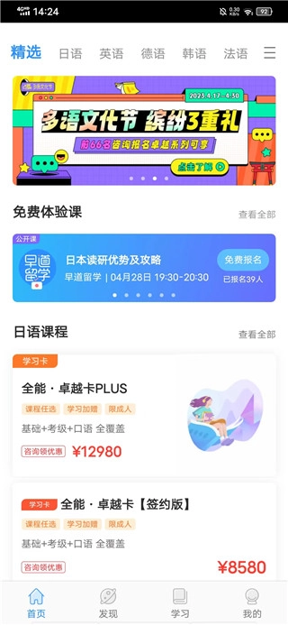 1. 多语种线上学习:涵盖日语、德语、西班牙语、法语、韩语。