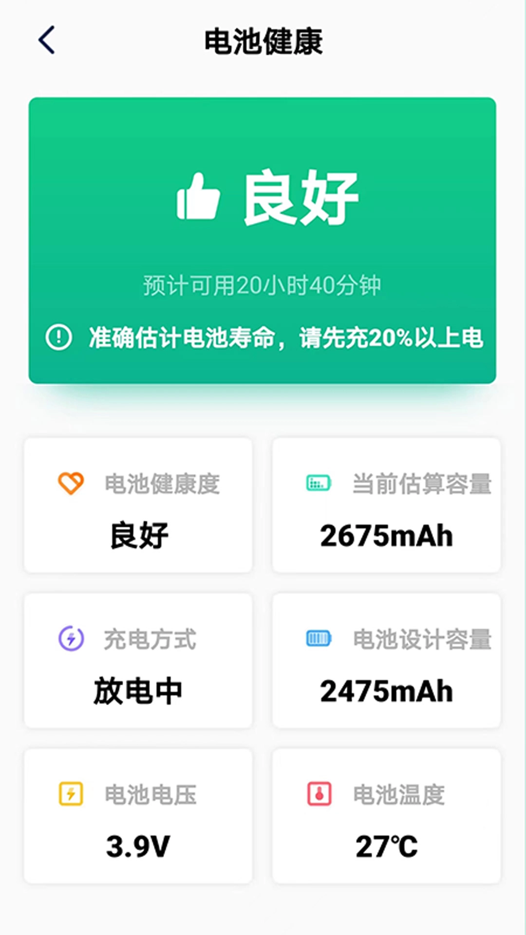 3. 电池健康状况检查:对电池当前所处状态进行检测,并预估电池的续航时长。