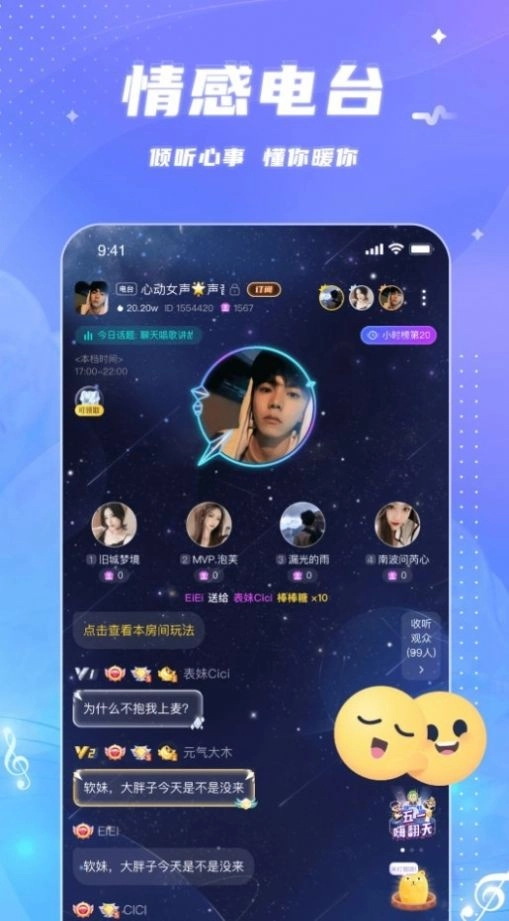 2、多样玩法:K歌嗨唱、贴心陪聊、欢乐娱乐、电台畅听、趣味游戏,全天24小时随时等你来互动!