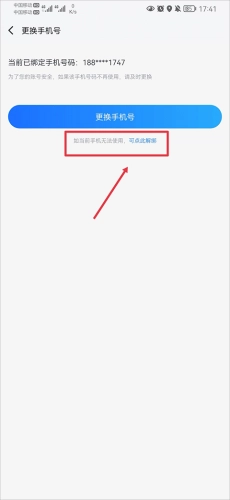 3、接着在“更换手机号”下方,点击“若当前手机无法使用,可点此解绑”。
