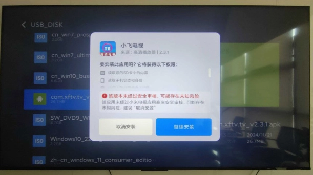 4、若电视此前从未通过U盘安装过软件,将会弹出提示,要求对安装未知来源应用进行授权,这时点击“允许”或“同意”以完成授权。