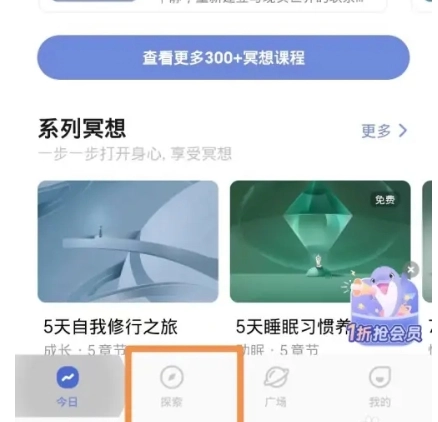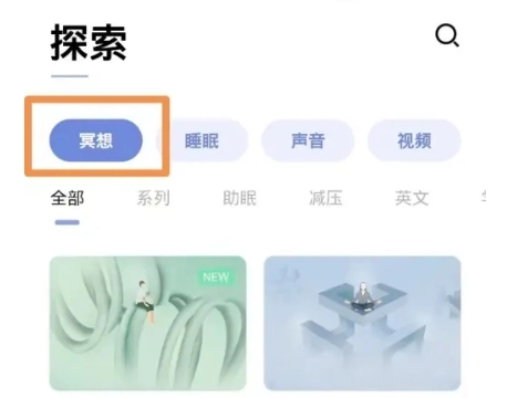 2. 在探索页面里,通过滑动查找并点击【冥想】栏目,随后进入。
