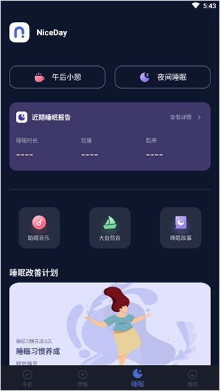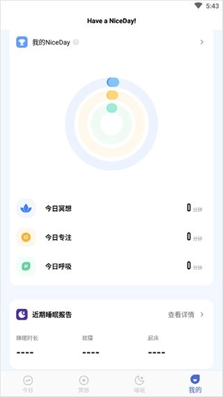 NiceDay是一位专注于帮你管理情绪、改善睡眠的贴心小帮手,尤其适合那些面临较大压力、长期睡眠不佳且心烦意乱的朋友们。它拥有一套完备且专业的冥想课程,能助力你于繁忙的生活中寻得片刻宁静。同时,它还具备极为贴心的睡眠监测功能,能够帮助你清晰了解自身的睡眠状况,从而逐步养成更为健康的作息习惯。 当你使用NiceDay时,借助冥想练习,你可以学会放松心态,有效缓解日常的焦虑与压力,让自己在白天能够更加专注,工作或学习效率更高。到了夜晚,你也能够轻松入睡,彻底摆脱失眠的困扰,使每一天都过得更加舒心惬意,将焦虑与烦恼统统抛诸脑后,重新找回内心的平静与能量。