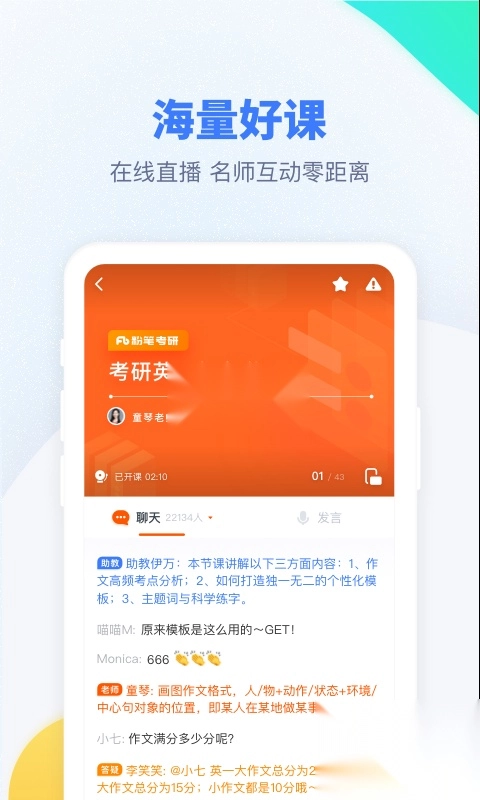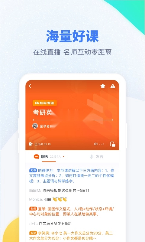 3. 在线直播学习,能跟着老师的直播同步学习,实现实时互动。同时,有助教实时跟进并划出重点,让你高效掌握复习要点。在线观看时,高品质音质能确保良好的上课体验,而且观看所消耗的流量较少。