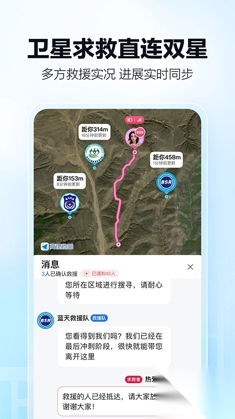 - 卫星求救直连两颗卫星,呈现多方救援实际状况,进展同步实时更新