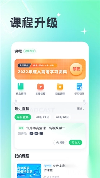 成人高考宝典,是杭州课房科技有限公司精心打造的成人高考在线教育资讯与学习平台。其软件界面简洁直观,功能丰富多样,涵盖热门院校、热门专业、成考流程、资料领取、人工客服、摸底考试、精品课程、直播课程、历年真题、模拟测试等诸多实用功能,助力考生随时随地开启学习之旅。