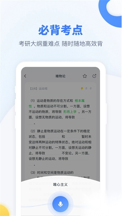 按照考研各科目知识点梳理出重点,对考点进行挖空处理,并提供语音填写、手动填写等多种带背功能。