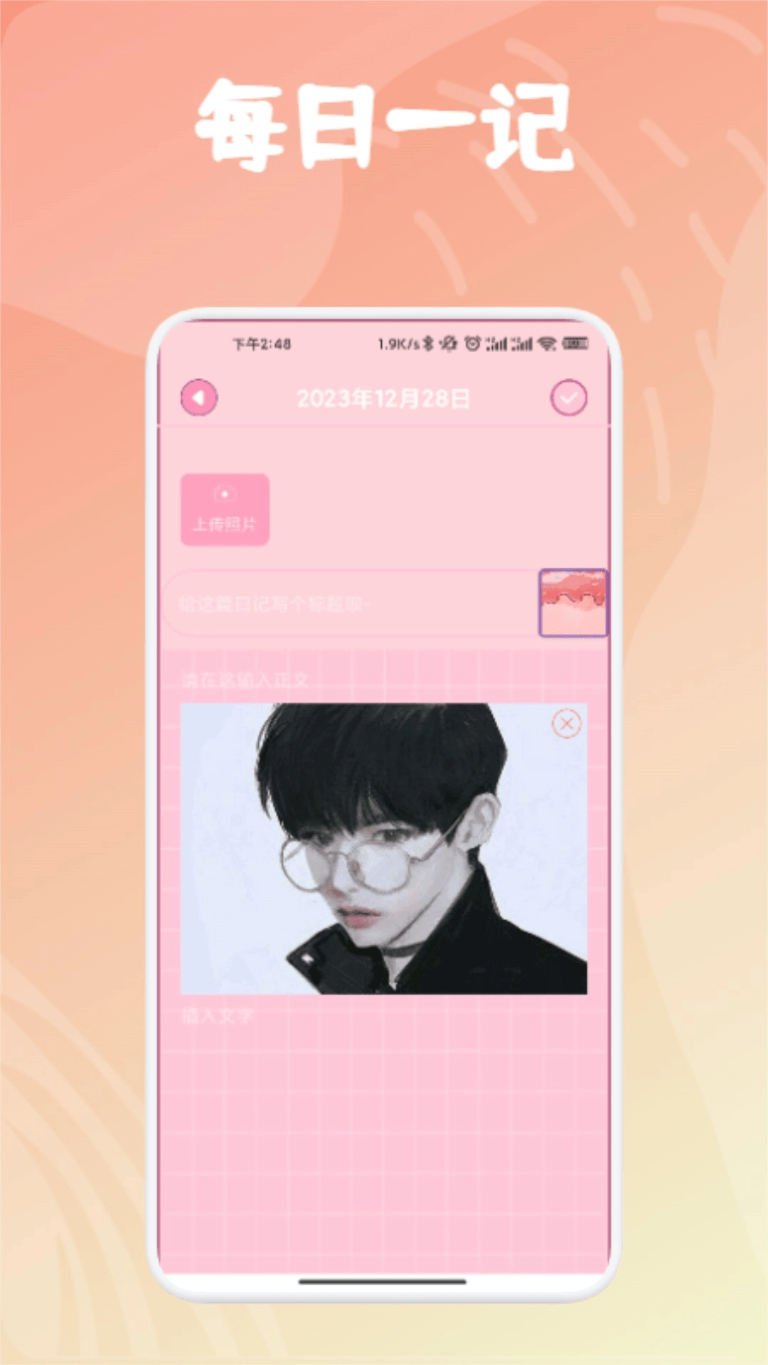 3. 写日记时,添加图片与否均可。先写好日记标题,接着在标题下方输入正文,完成后点击右上角的保存按钮。