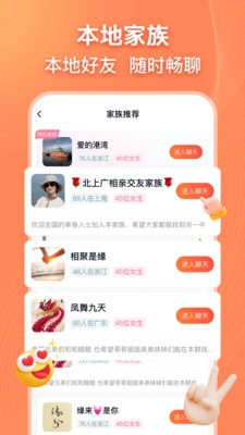 3、具备家族群聊功能,身处同城的用户能够寻觅到自己感兴趣的圈子并结交朋友。