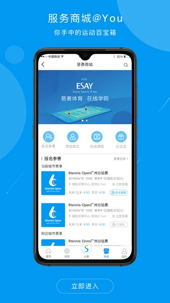 易赛体育手机版是为体育爱好者量身定制的开放体育平台,秉承“EnjoySports”的核心理念,集智慧头条、开放赛事、专属社区和服务商城于一体,致力于为用户提供纯粹的体育快乐。通过手机版,用户可以随时随地获取最新的体育资讯,参与赛事活动,与社区好友互动,享受便捷的体育服务。无论是资深体育迷还是初学者,易赛体育手机版都能满足你的需求,让体育生活更加丰富多彩。
