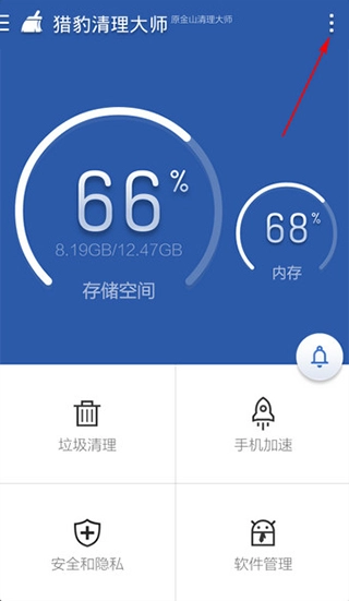 1. 开启猎豹清理大师软件后,能够运用垃圾清理、手机加速、CPU降温、病毒查杀、超强省电以及通知栏清理等功能。